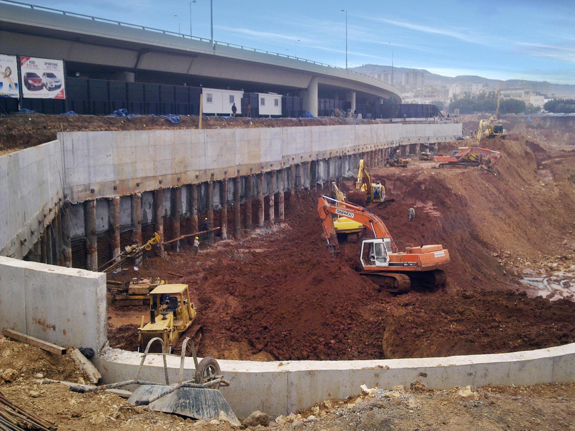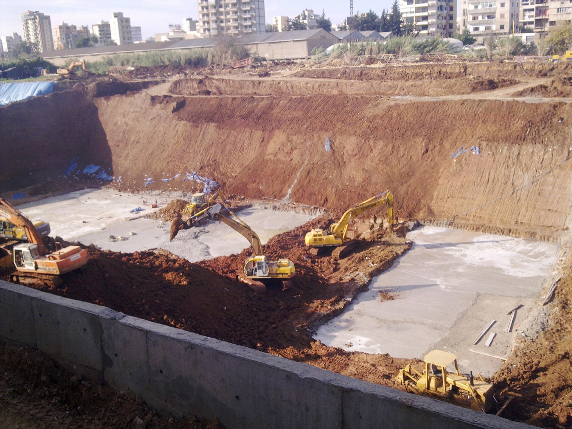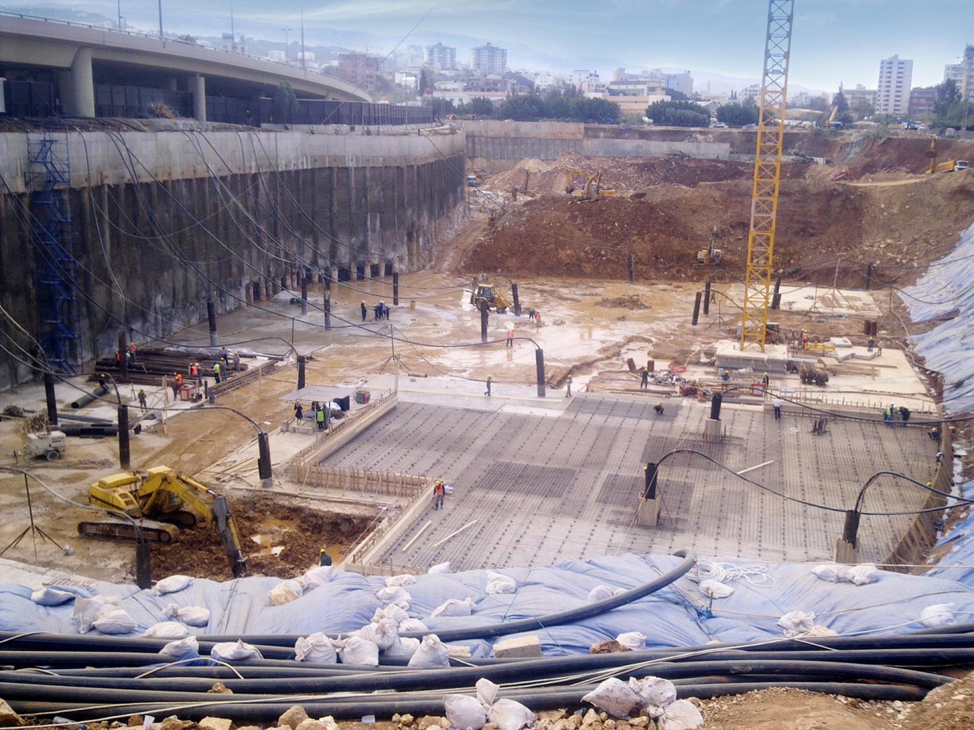 The BEIRUT CITY CENTER project consisted of shoring works, the excavation and removal of more than 600,000 m3 of material, the execution of secant and distance piles, the installation of anchors and shotcrete, the excavation of the natural ground level down to the excavation of the bottom levels, supplying and installing a continuous dewatering system, ground improvement, soil replacement, cavity probing, leveling and compaction and preparation of the site for concrete blinding.