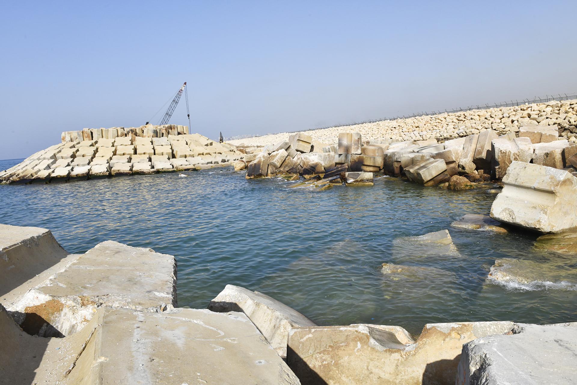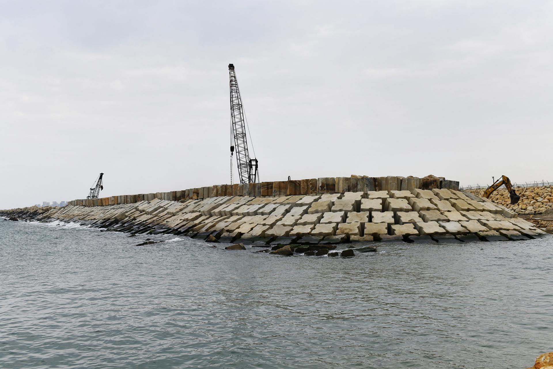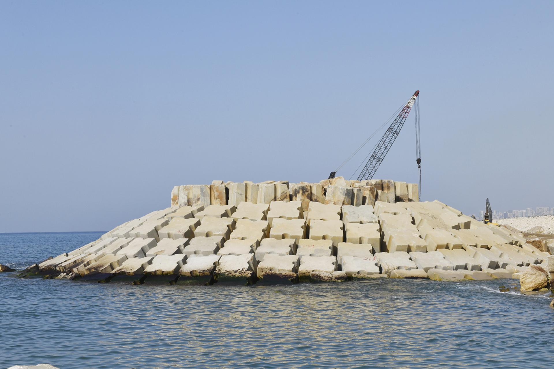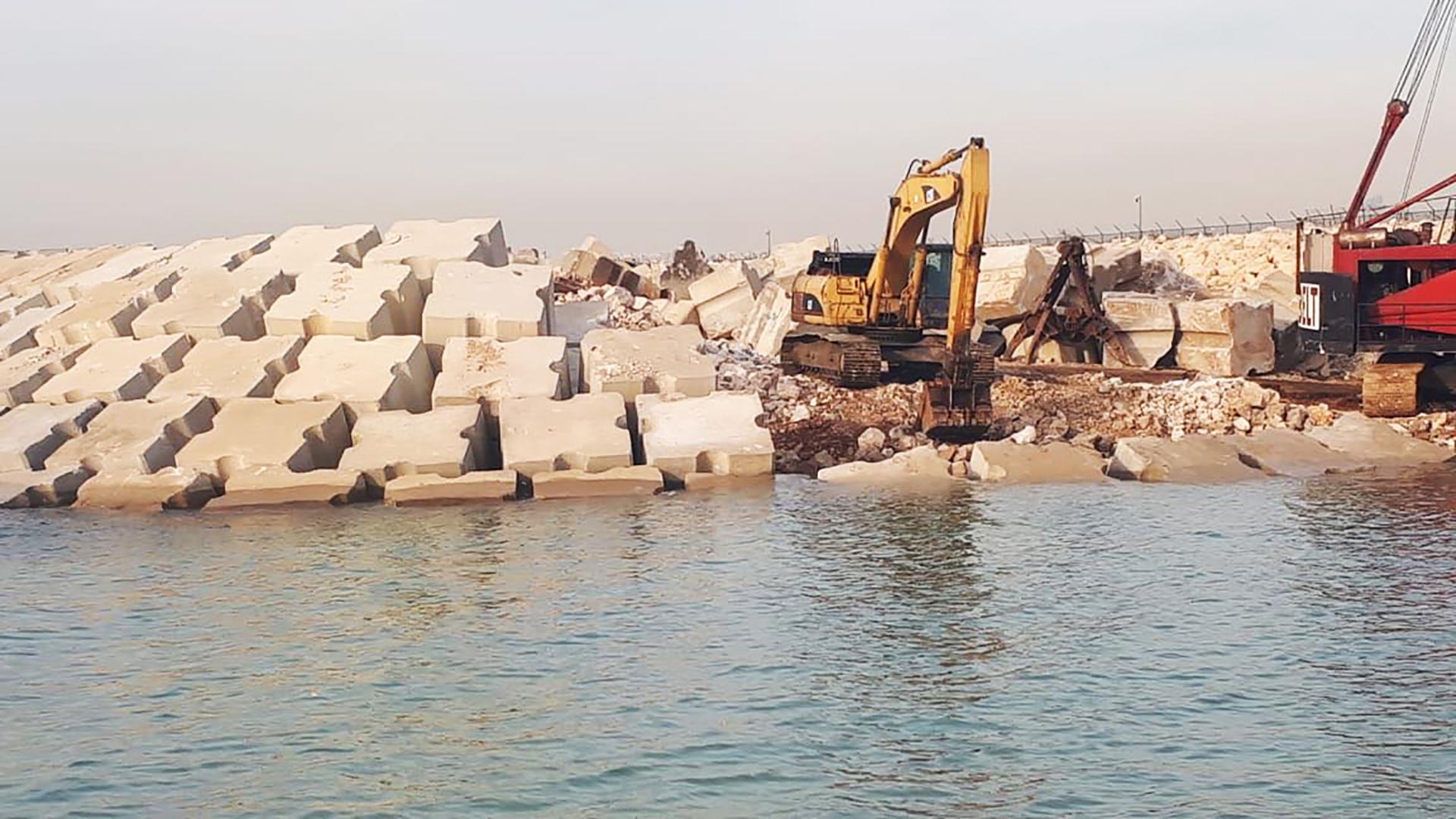 Primer's work at RAFIC HARIRI INTERNATIONAL AIRPORT involved the rehabilitation of the existing breakwater of the airport's runway (length 2.3 km) by increasing the top level of the breakwater, replacing the existing concrete blocks according to the new design and profile, removing broken blocks, casting and installing new concrete blocks with volumes ranging from 6.5 to 20.5 m3, installing rock layers and dredging soil underwater to ensure the designed draft level of the channel between the breakwater and the runway.