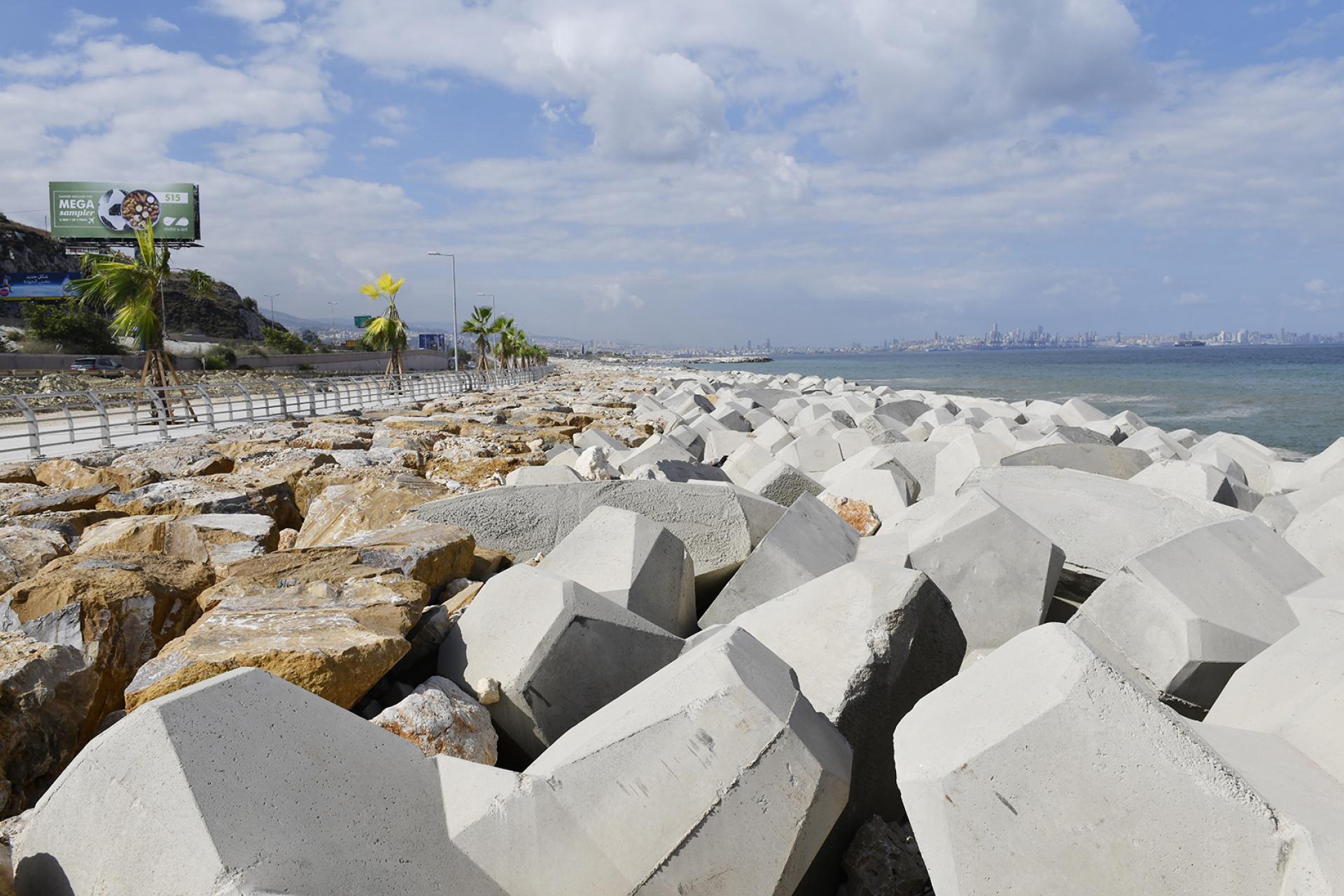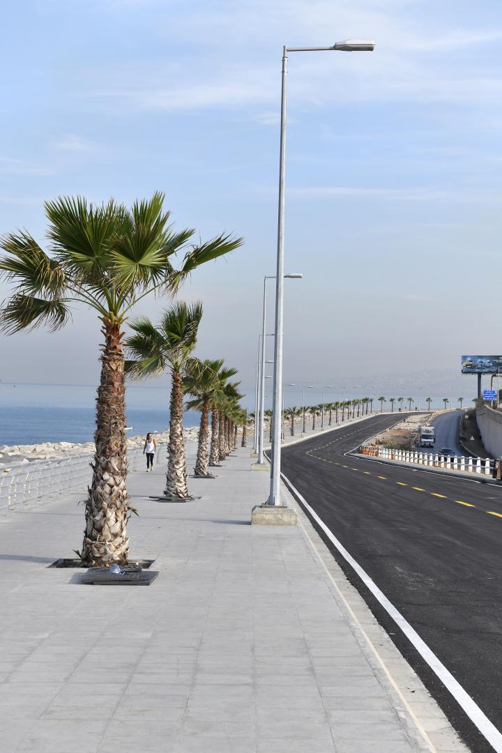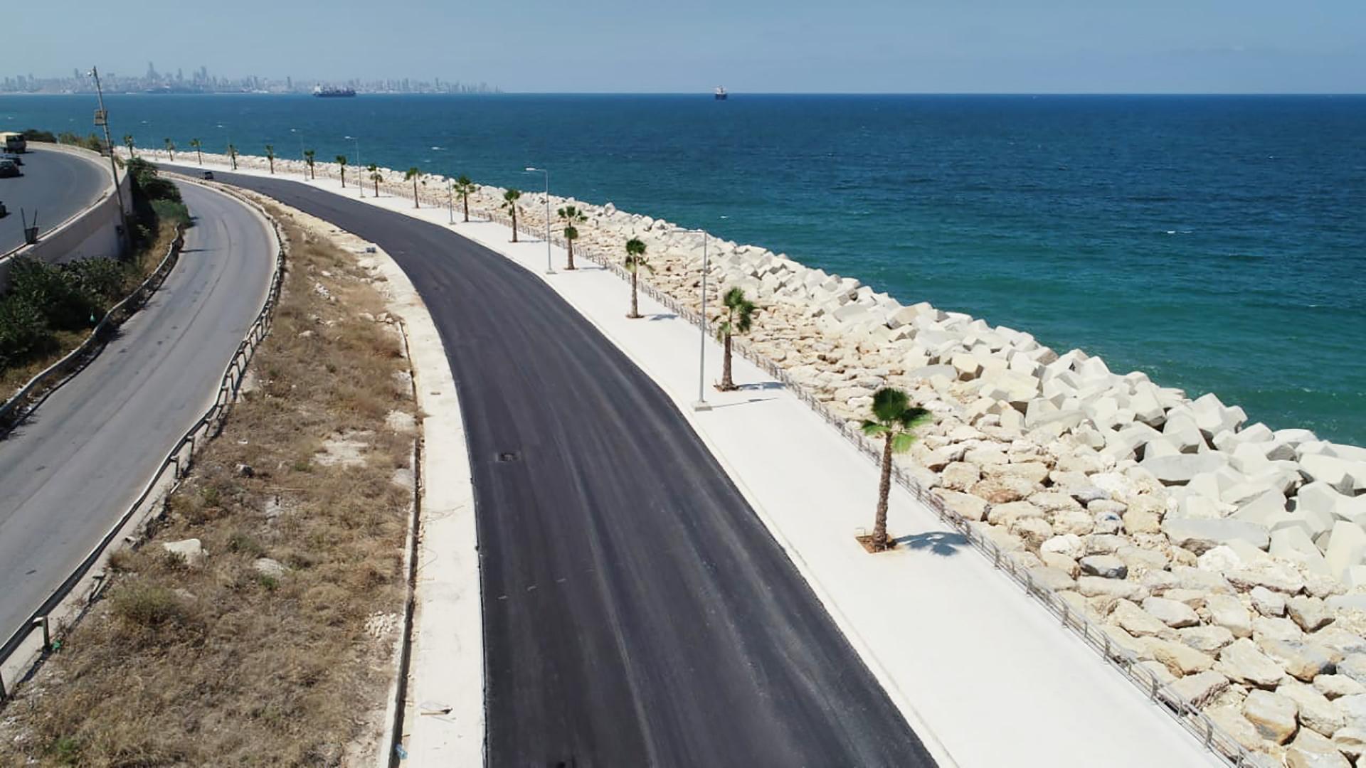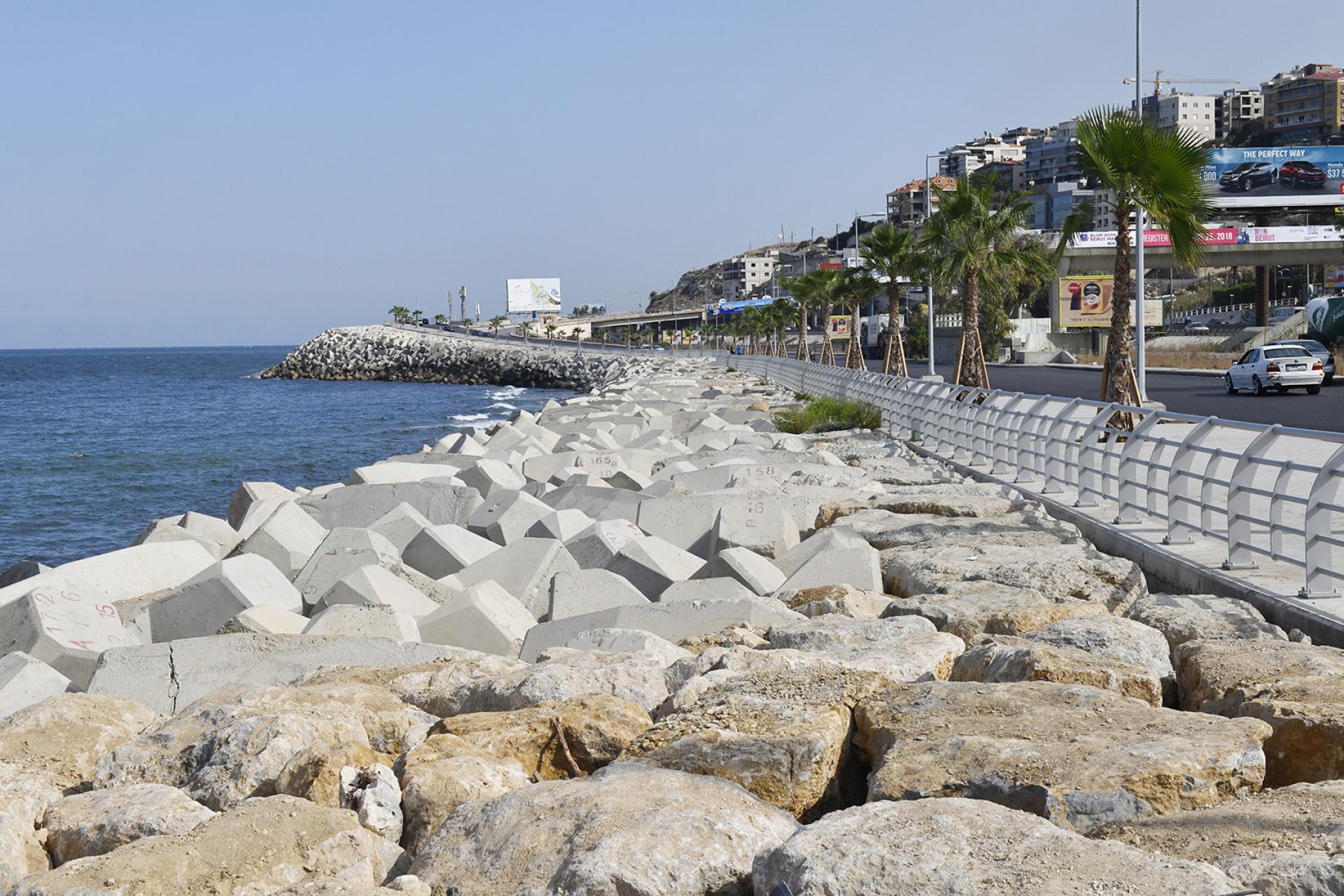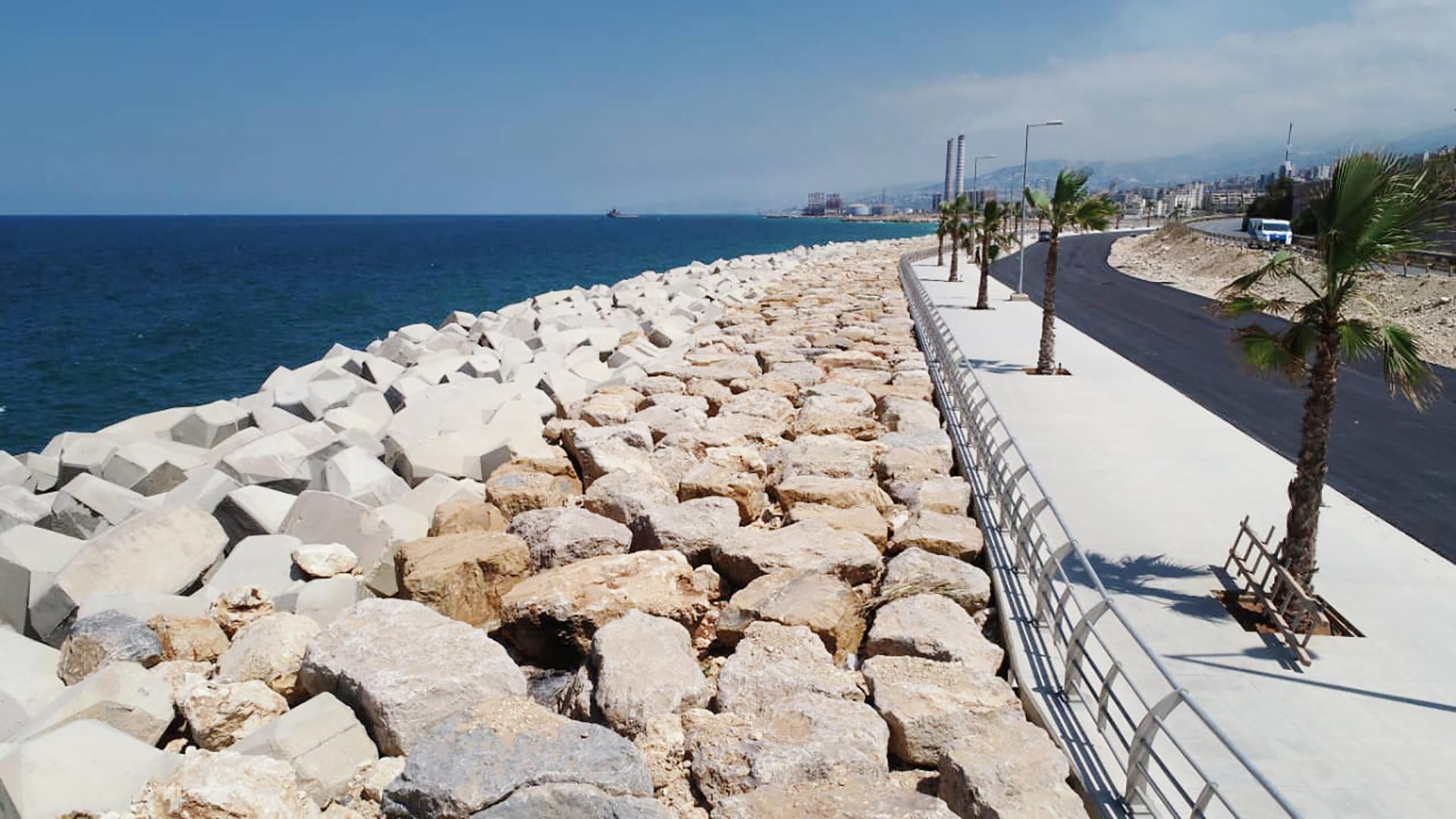 The REHABILITATION OF DBAYEH ROAD consisted of the removal of debris and soil materials resulting from the road's collapse, executing the revetment with the toe along the length of the road by supplying and installing 0.5 to 15-ton rocks and 16-m3 concrete Accropode units above and below the water in order to widen the protection and ensure the safety of the road, rehabilitation of the sidewalks and installation of new urban furniture, laying new layers of asphalt, installing cat eyes and road markings, and supplying and installing street lighting.