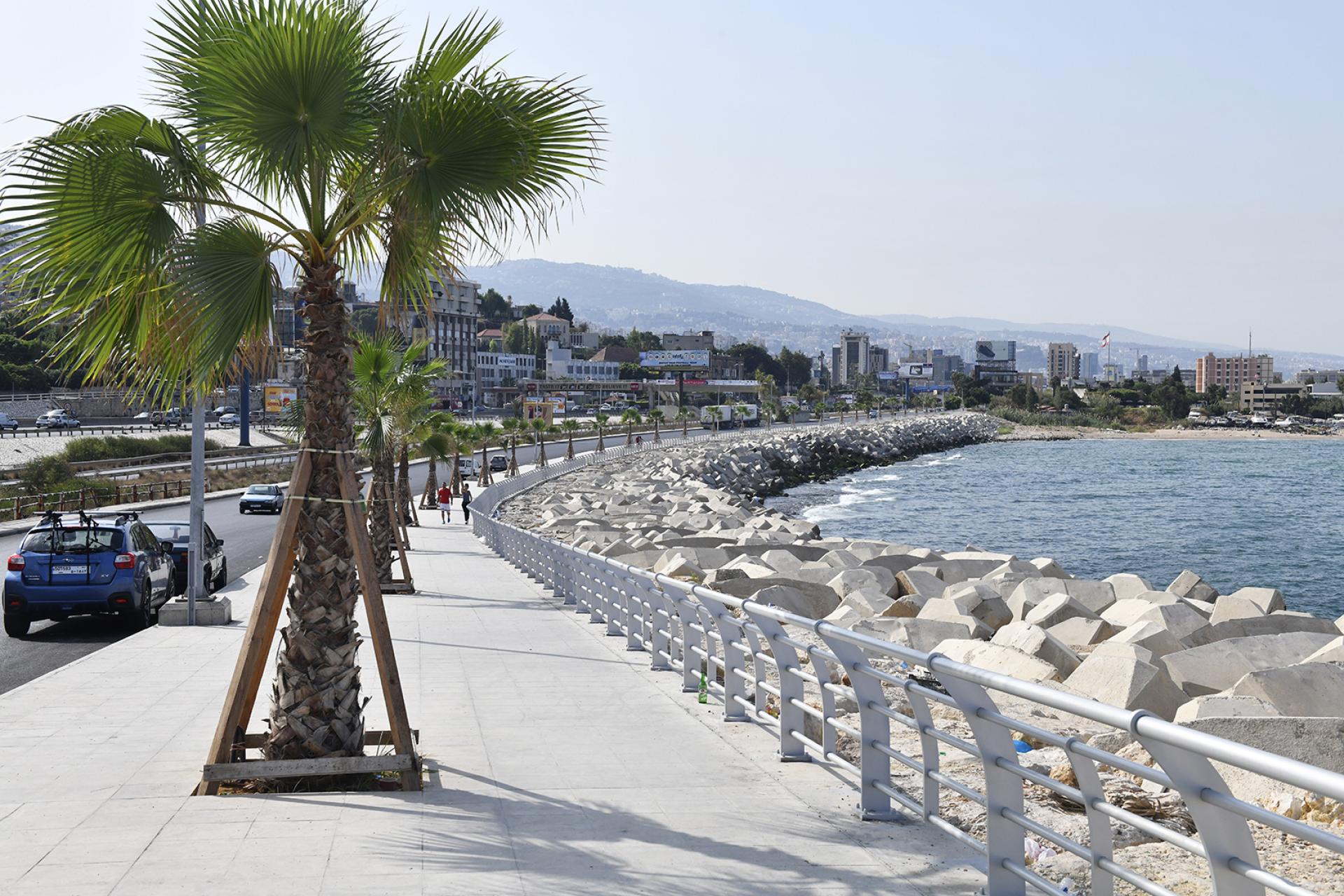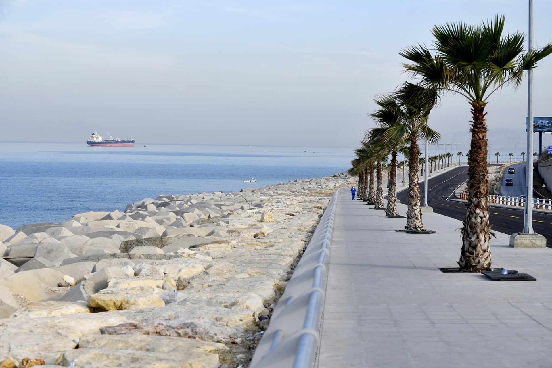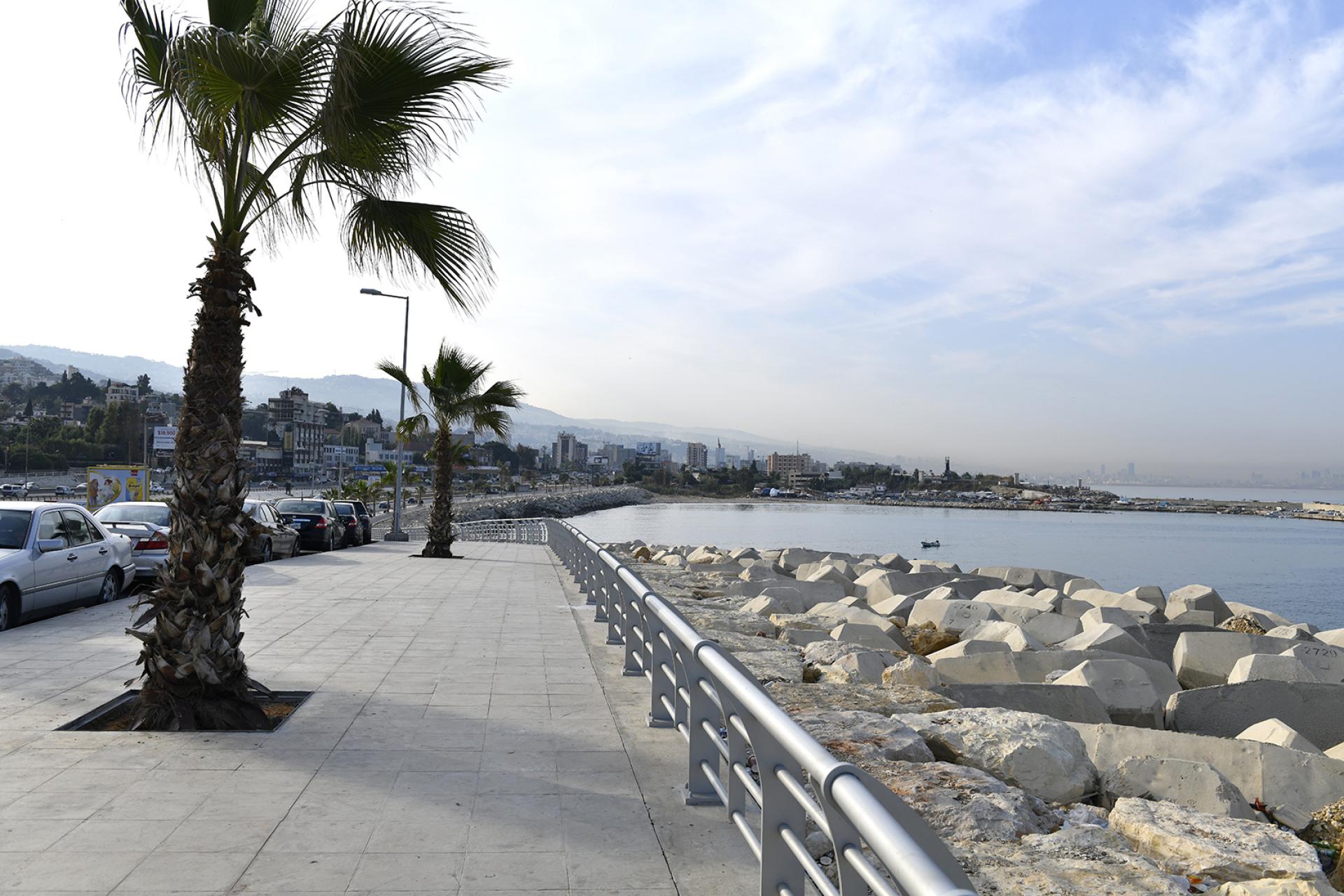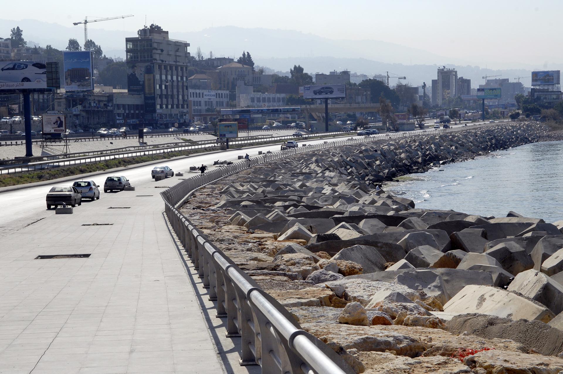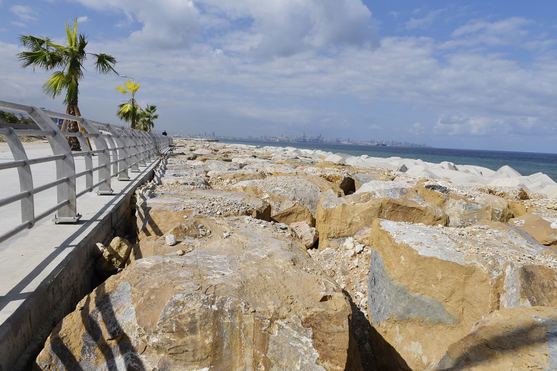 The REHABILITATION OF DBAYEH ROAD consisted of the removal of debris and soil materials resulting from the road's collapse, executing the revetment with the toe along the length of the road by supplying and installing 0.5 to 15-ton rocks and 16-m3 concrete Accropode units above and below the water in order to widen the protection and ensure the safety of the road, rehabilitation of the sidewalks and installation of new urban furniture, laying new layers of asphalt, installing cat eyes and road markings, and supplying and installing street lighting.